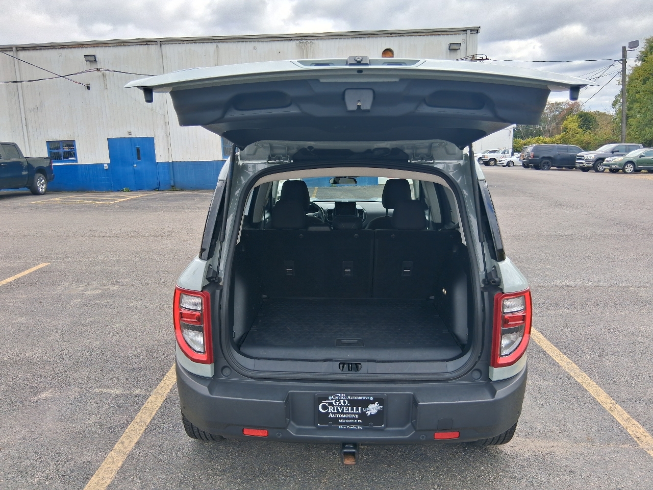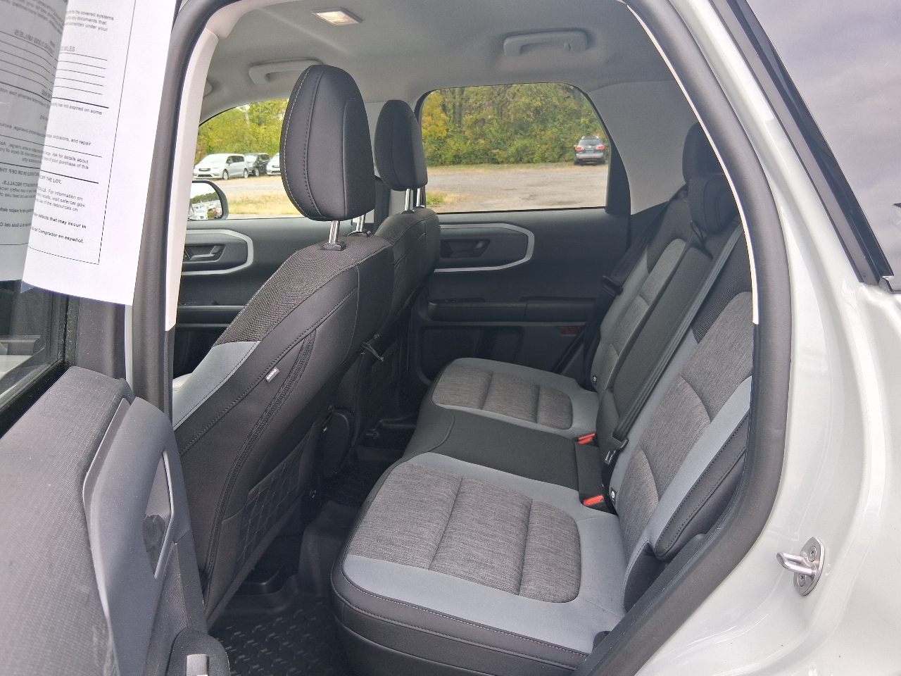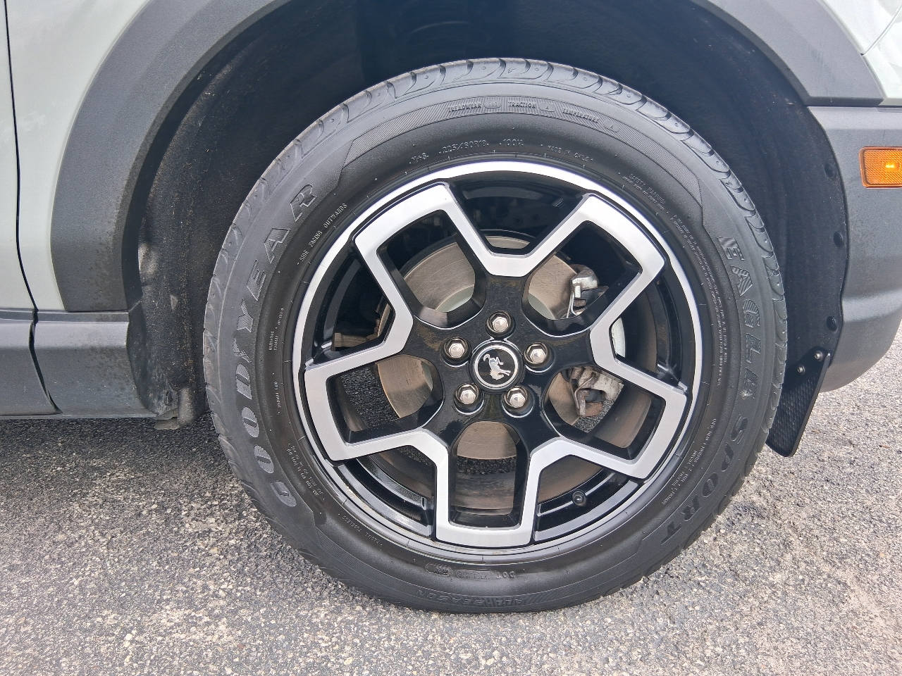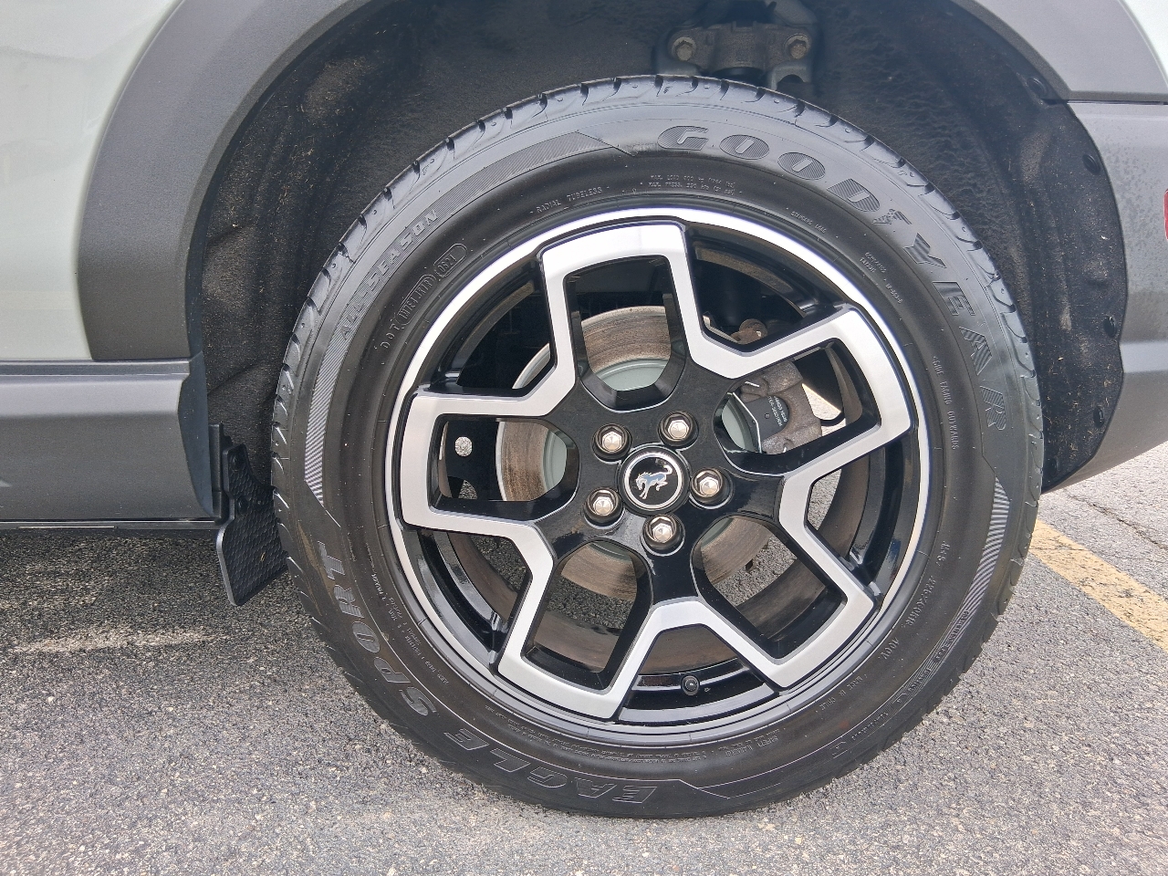 The exterior of this Bronco Sport is both stylish and functional, with a sleek gray grille, LED brakelights, and black accents giving it a bold and rugged look. The steel spare wheel and compact spare tire mounted inside under cargo ensure you're always prepared for the unexpected.