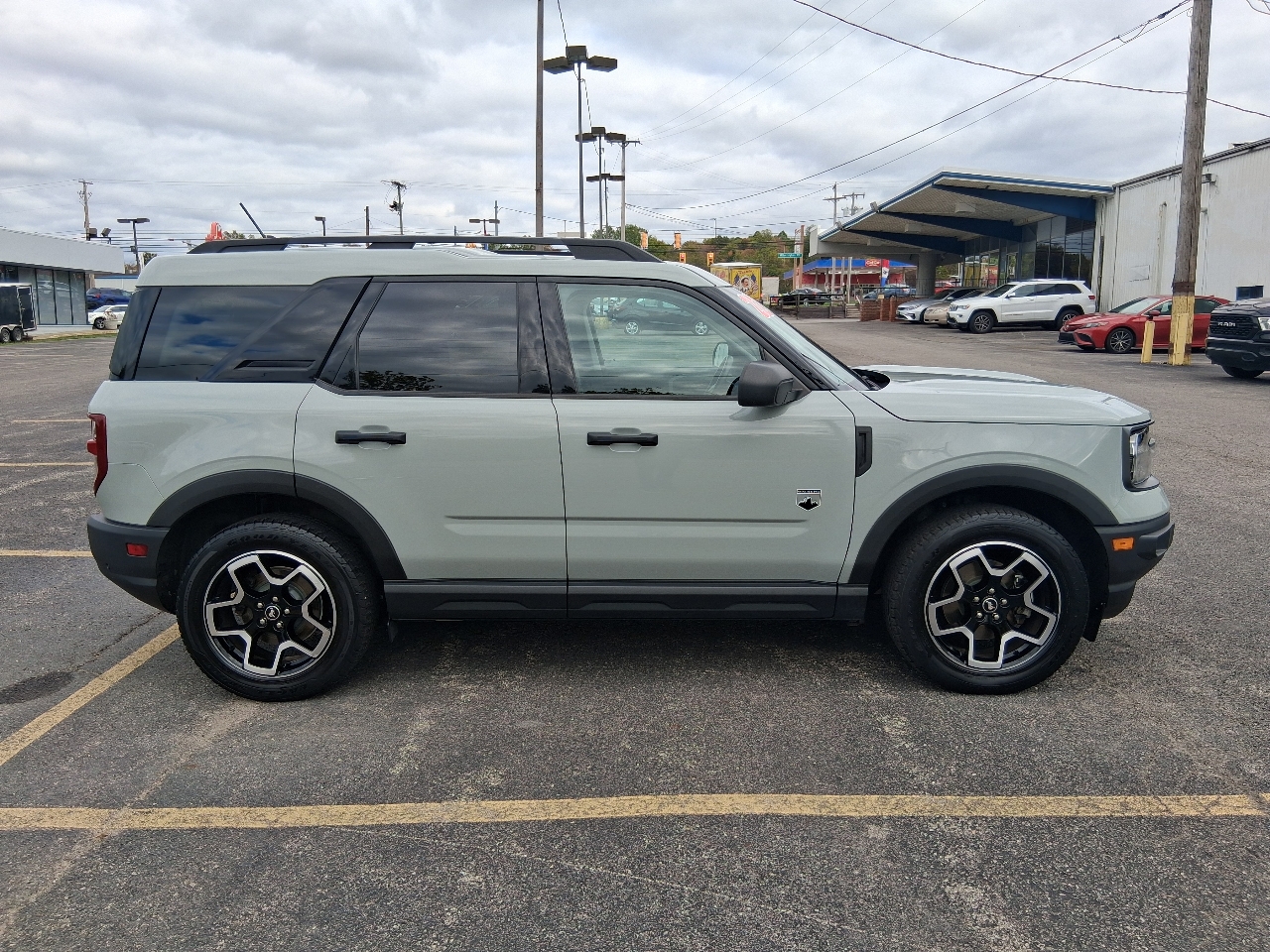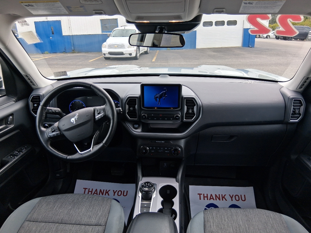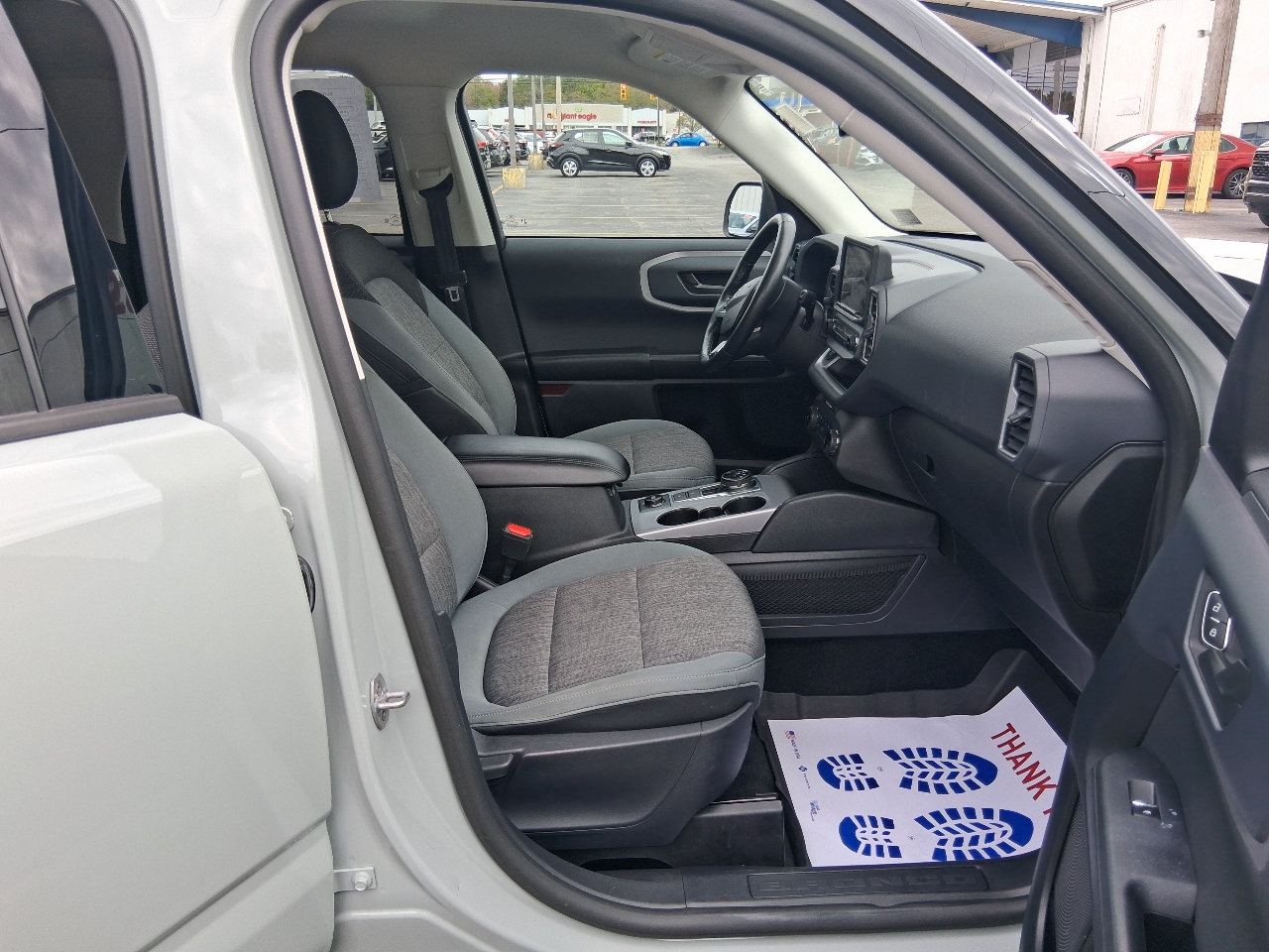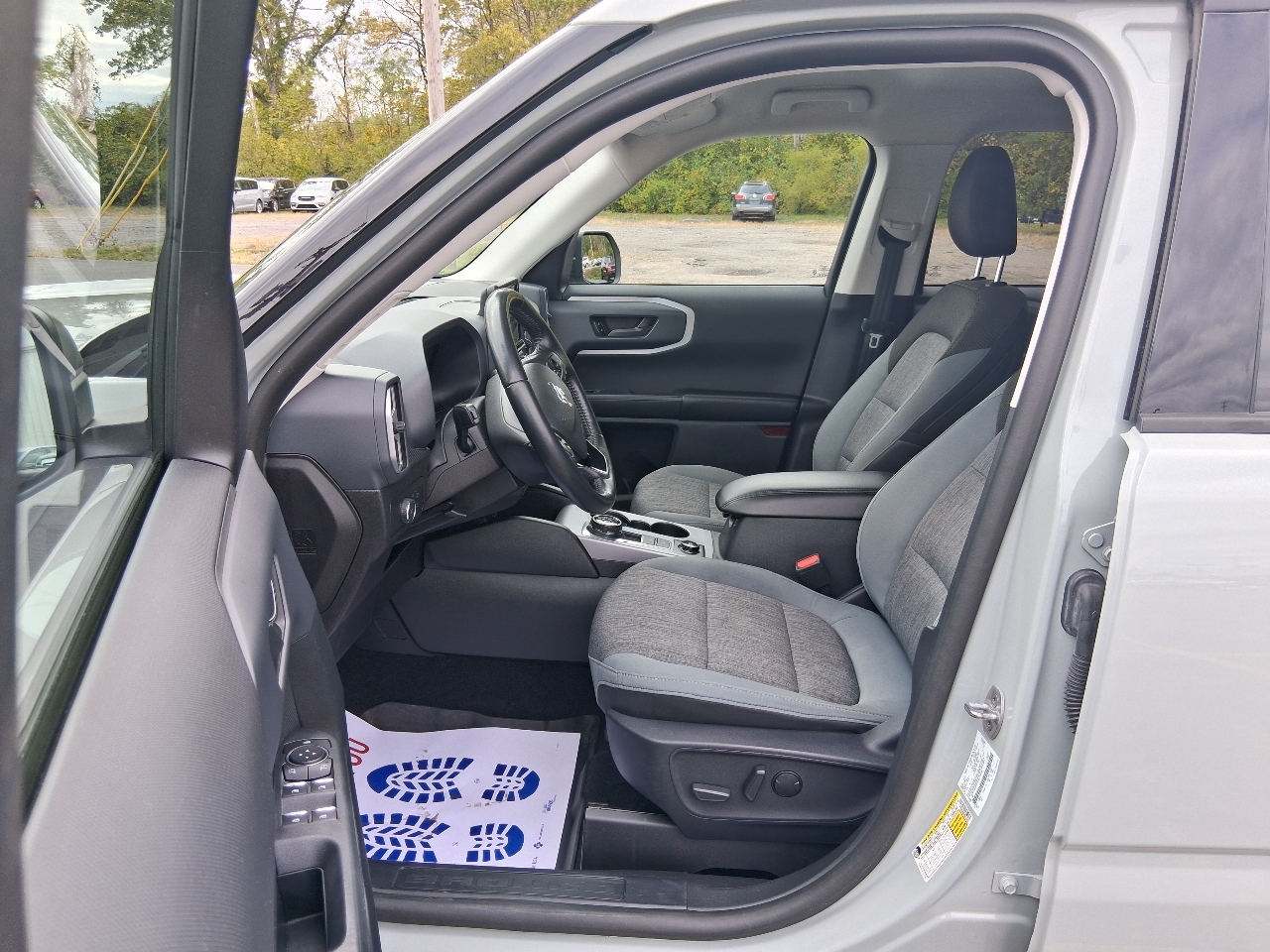 The exterior of this Bronco Sport is both stylish and functional, with a sleek gray grille, LED brakelights, and black accents giving it a bold and rugged look. The steel spare wheel and compact spare tire mounted inside under cargo ensure you're always prepared for the unexpected.